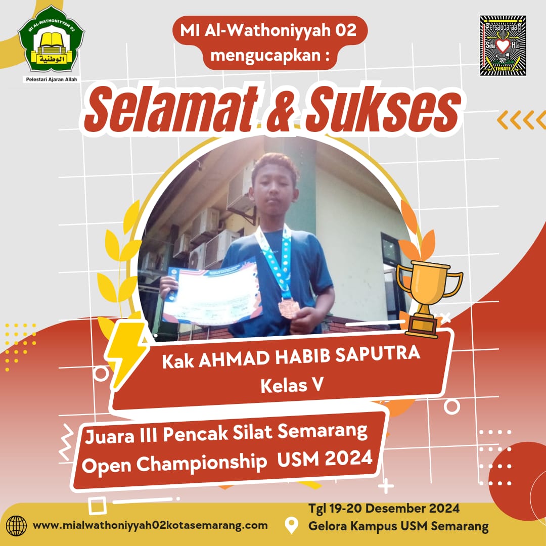 AHMAD KHABIB SAPUTRA, siswa kelas V Madrasah Ibtidaiyyah Al-Wathoniyyah 02 Bugen Tlogosari Wetan Pedurungan Kota Semarang, berhasil meraih prestasi membanggakan…